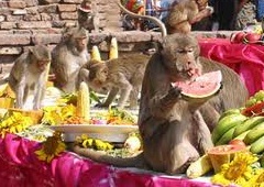 banket-dla-obezyanНедавно три тысячи обезьян пировали на банкете, который им устроили жители тайской провинции Лопбури. Этот пир был проведен в честь этих непосед.